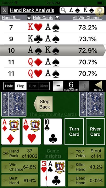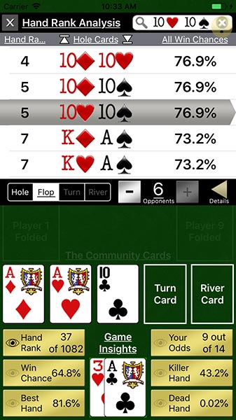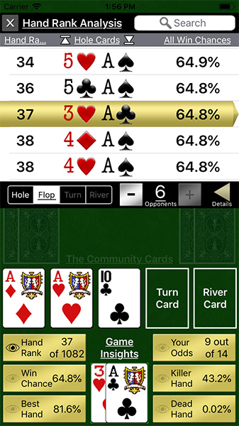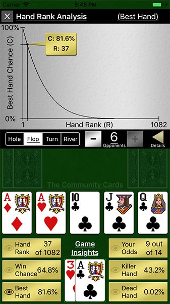 Hand Rank Analysis - See how your dealt hand ranks, how your win chance changes with differing # of opponents, and examine your best hand chances throughout the game.