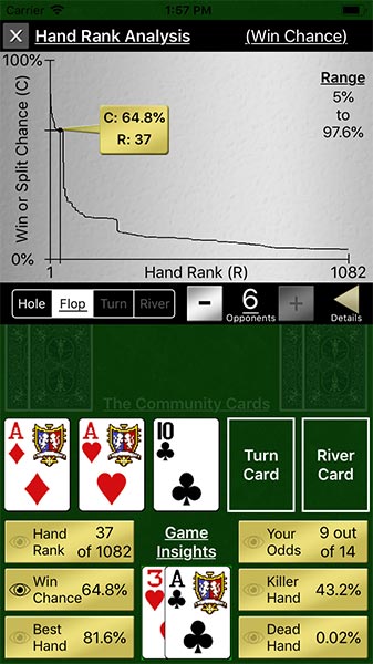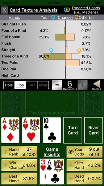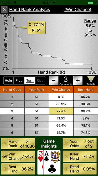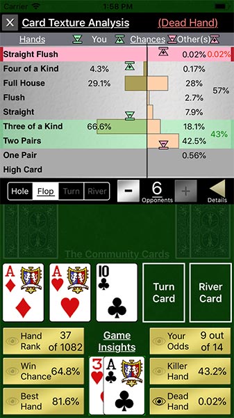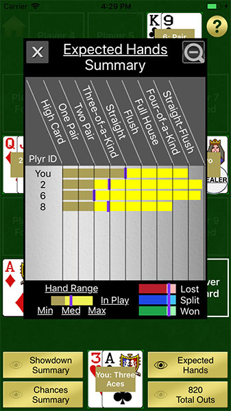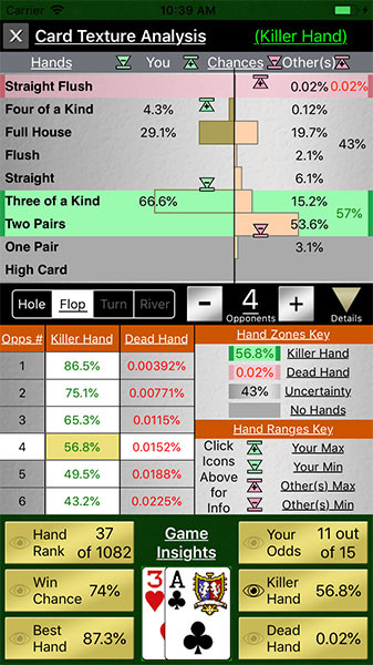 Card Texture Analysis - Examine your odds of various expected hands vs opponents, (including median hands), and your chances of having a killer hand or a dead hand throughout the game.