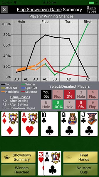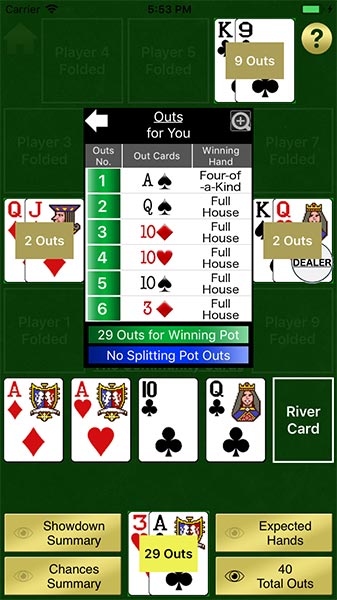 Access round detail summaries with expected hands and outs for each player. Chances and Final Hands are also included.